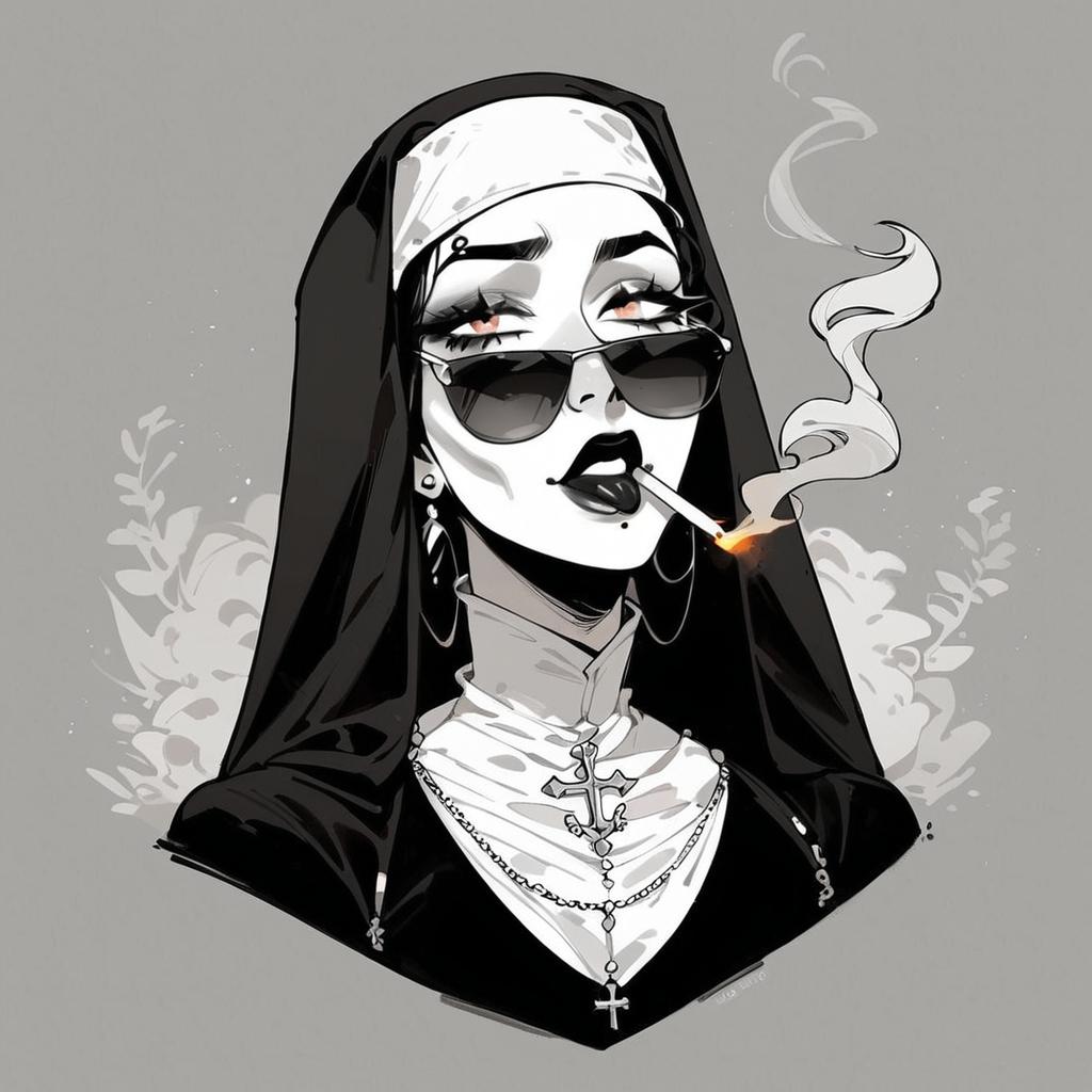 Score_9, score_8_up, score_7_up, Italian film nun, chinese vintage sunglasses, cool model face, hold a cigarette in mouth, gothic black and white style, Lady Gaga, Kaete Butcher, deconstructive, film/ video, pastoral charm, anti - aesthetic, tightly cropped composition, deconstructed pop style, Gustave Moreau, exaggerated features