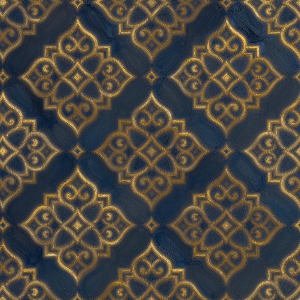 Scrollworks pattern featuring Islamic-inspired arabesque scrollwork with geometric flourishes in aged gold scrollwork on deep midnight blue arranged as seamless repeating wallpaper pattern with interlocking flourishes on digital UI background for a fantasy game rendered as oil painting style with soft blended highlights and brush texture, ultra-detailed, sharp ornamental design, high resolution, intricate decorative pattern art