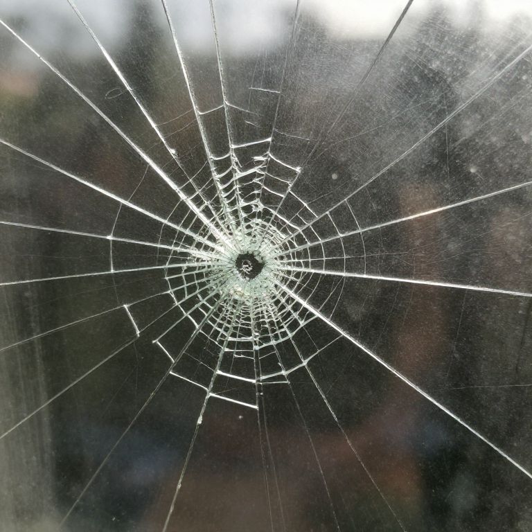 Close-up photograph of a spiderweb with multiple cracks, centered on a glass window. Background is blurred, dark green foliage.