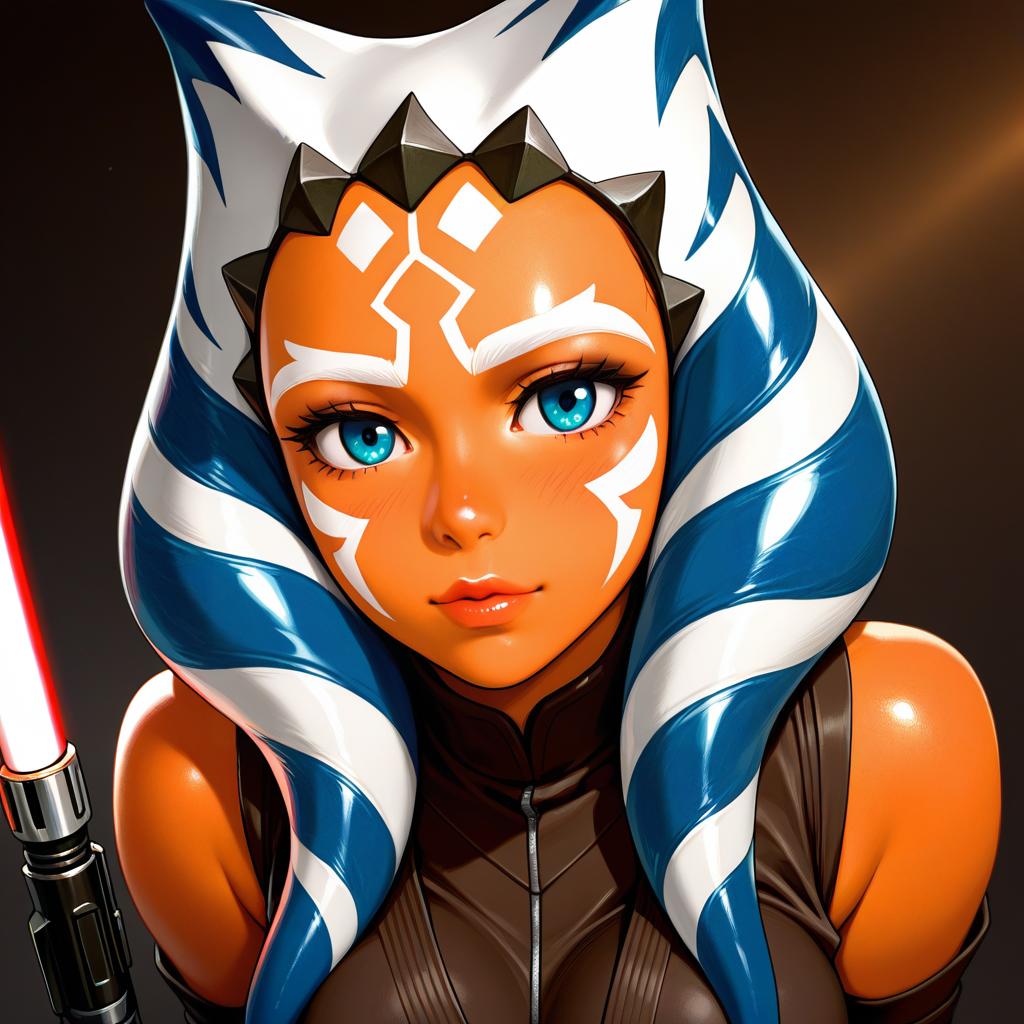 Ahsoka tano, star wars, 1girl, orange skin, lips, blue eyes, tentacle hair, medium breasts, large breasts, facial tattoo, alien, togruta, jedi, lightsaber, by artist mamimi (mamamimi), illustrious