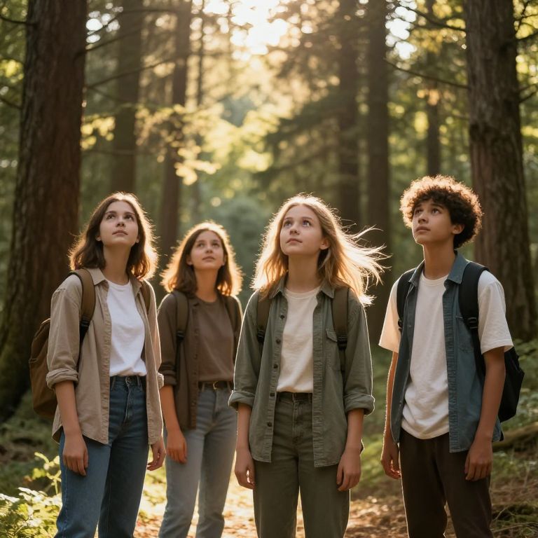 Portrait of youth in a serene forest clearing, golden sunlight filtering through tall trees, faces illuminated with curiosity and wonder, wearing casual modern clothes, with a gentle breeze flowing, evoking feelings of peace, growth and connection to nature.