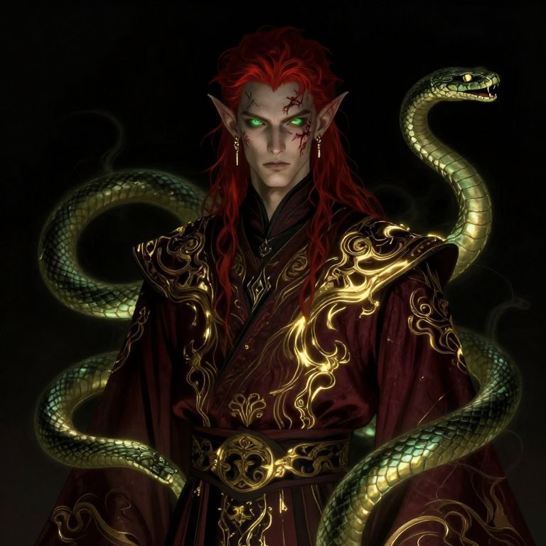 The image is a digital artwork in a dark, surreal, and fantastical style, It features a stylized male elven figure with a skin covered with scars, and medium red, tousled hair, He has pointed ears with gold earrings, His eyes glow with green light and he has vertical pupils, The figure is dressed in a dark burgundy, high-collared, flowing robe adorned with intricately, glowing golden patterns that intertwine with dark green, sinuous snakes, The snakes are depicted with an ethereal, almost spectral quality, their bodies shimmering with a mix of gold and dark green hues, blending seamlessly with the robe