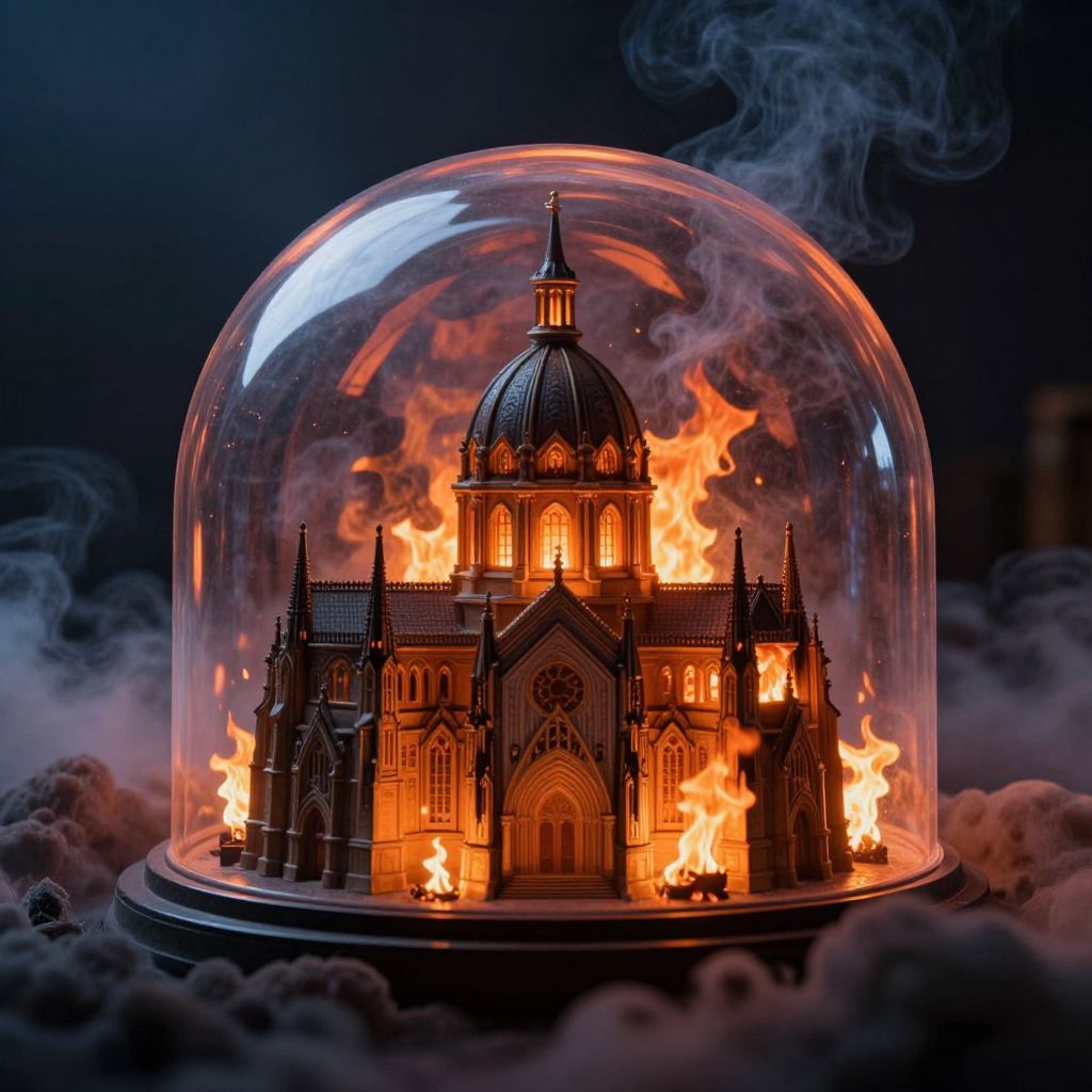 Photograph of a detailed, miniature neoclassical dome building encased in a transparent, iridescent bubble with rainbow reflections, set on a