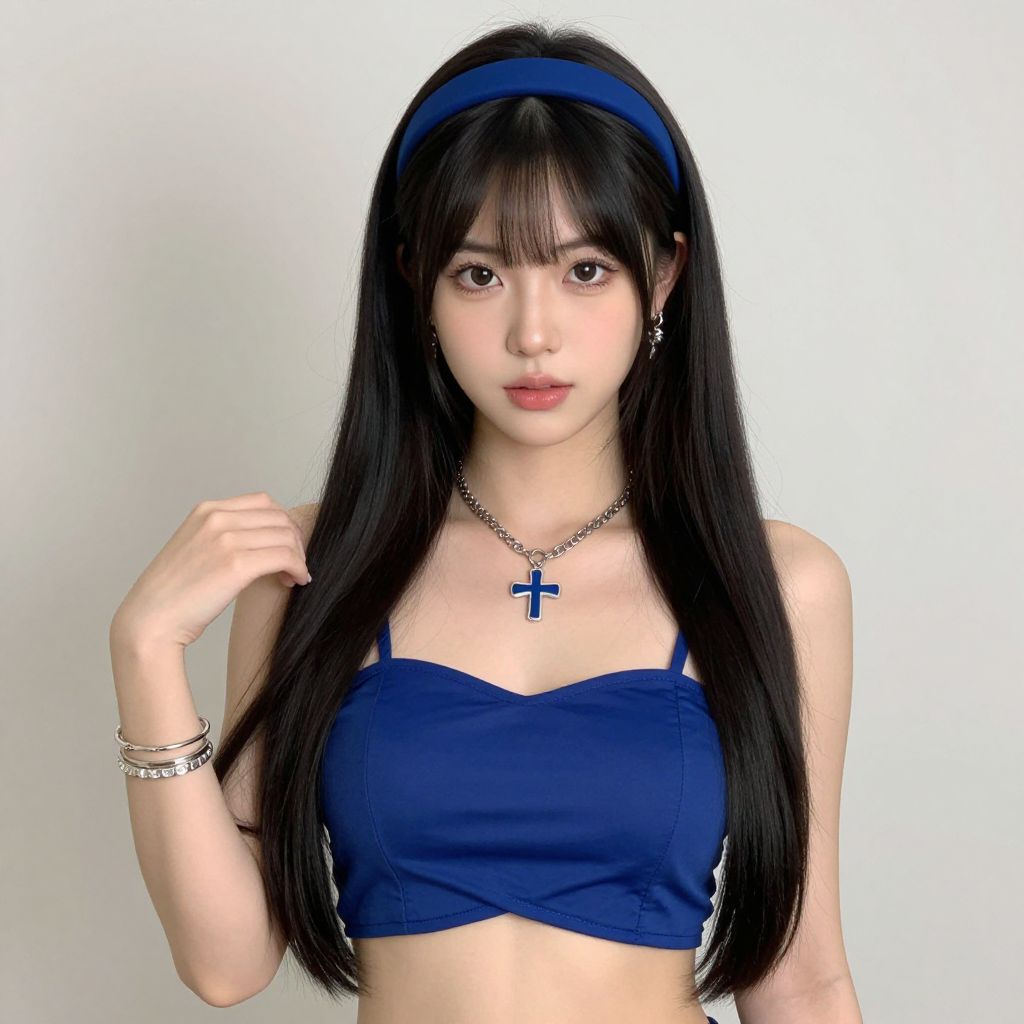 Toga costume outfit, 1girl, solo, jewelry, long hair, black hair, realistic, necklace, earrings, bracelet, hairband