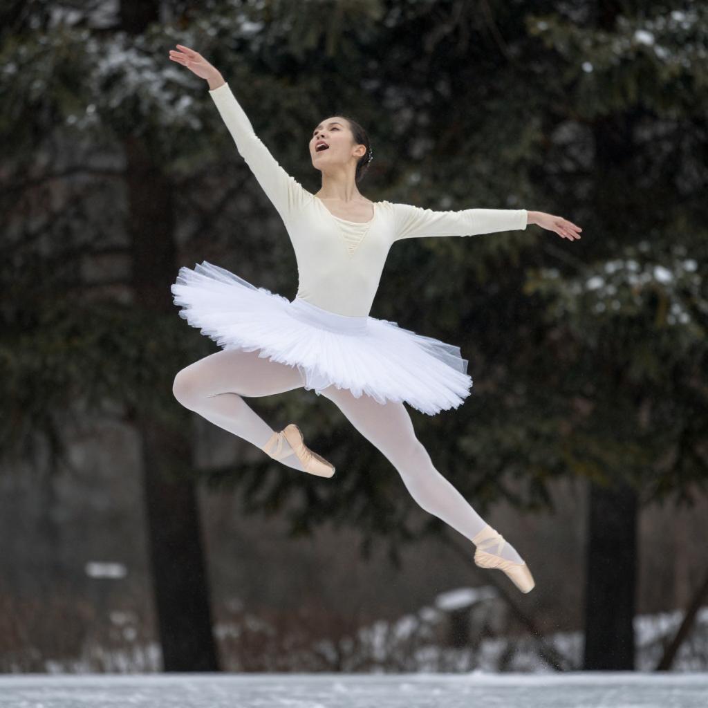 Young female ballet dancer, center stage, wearing black and blue costume with gold accents, red belt, and black tights. She stands on one leg, left arm raised, right leg extended backward. Dark, plain background. Ballet performance. Intense expression.