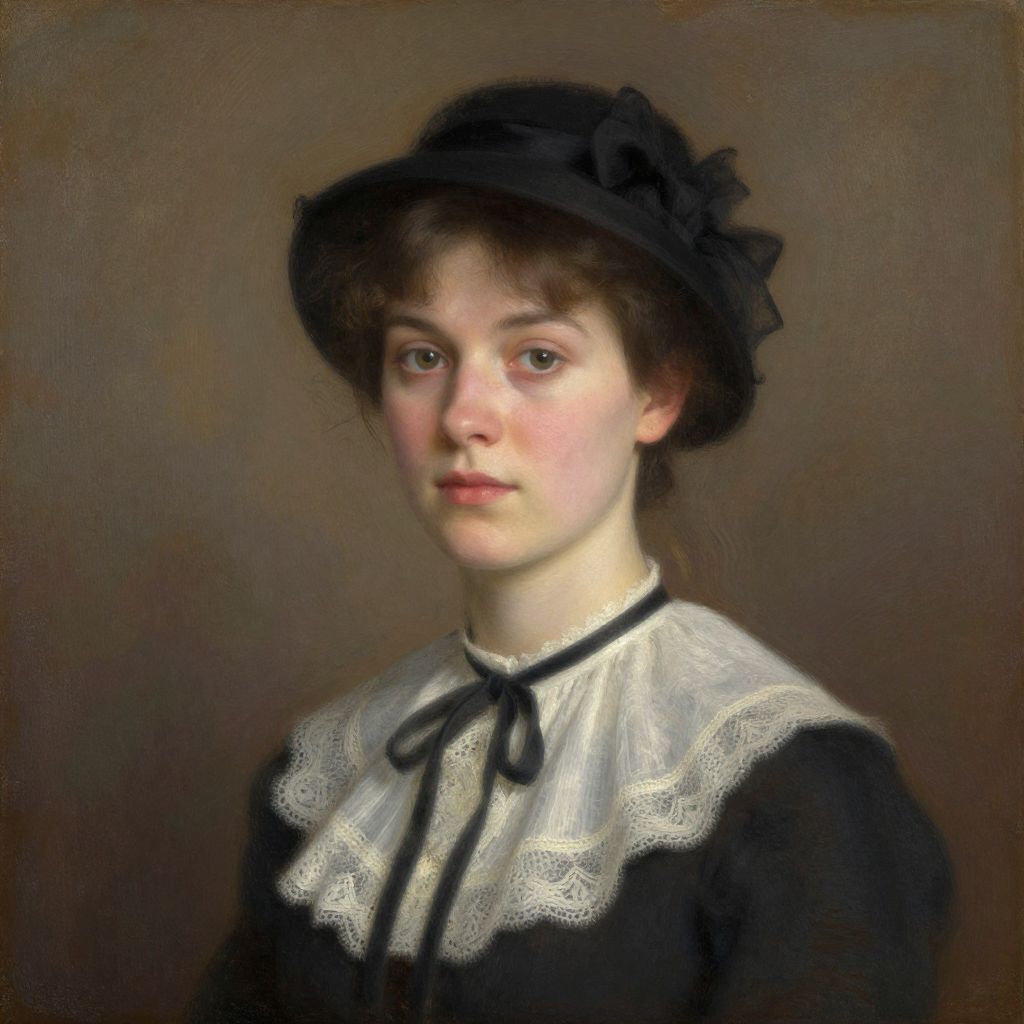 A vintage-inspired digital portrait reminiscent of Julian Alden Weir's style, featuring a gentlewoman adorned in a black hat and lace-trimmed blouse, set against a textured, earth-toned background with soft, natural lighting.