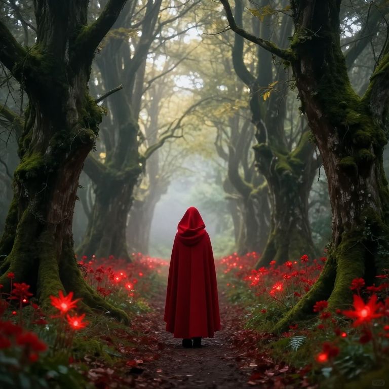 A solitary figure draped in a vibrant red cloak stands at the threshold of an ethereal forest, where sunlight filters through misty branches, casting an otherworldly glow over a path lined with glowing red flowers and ancient, moss-covered trees.