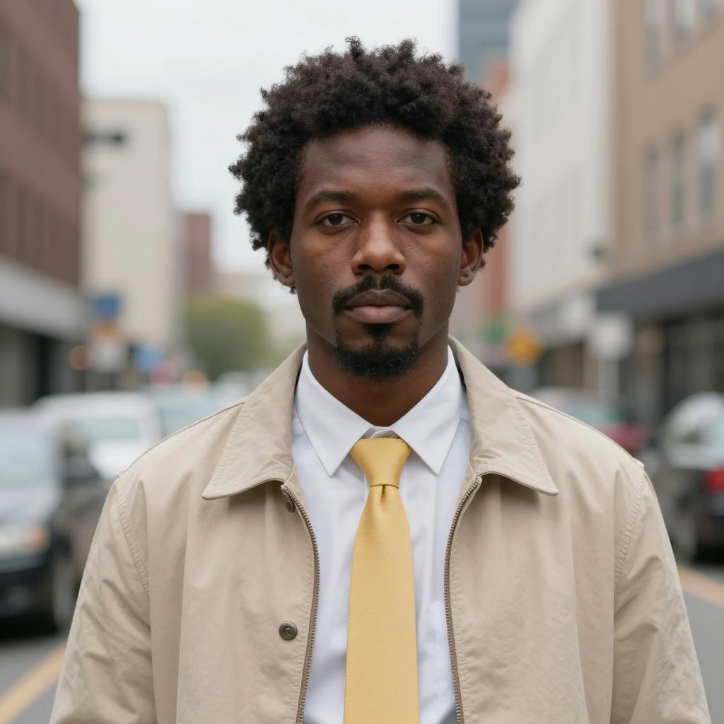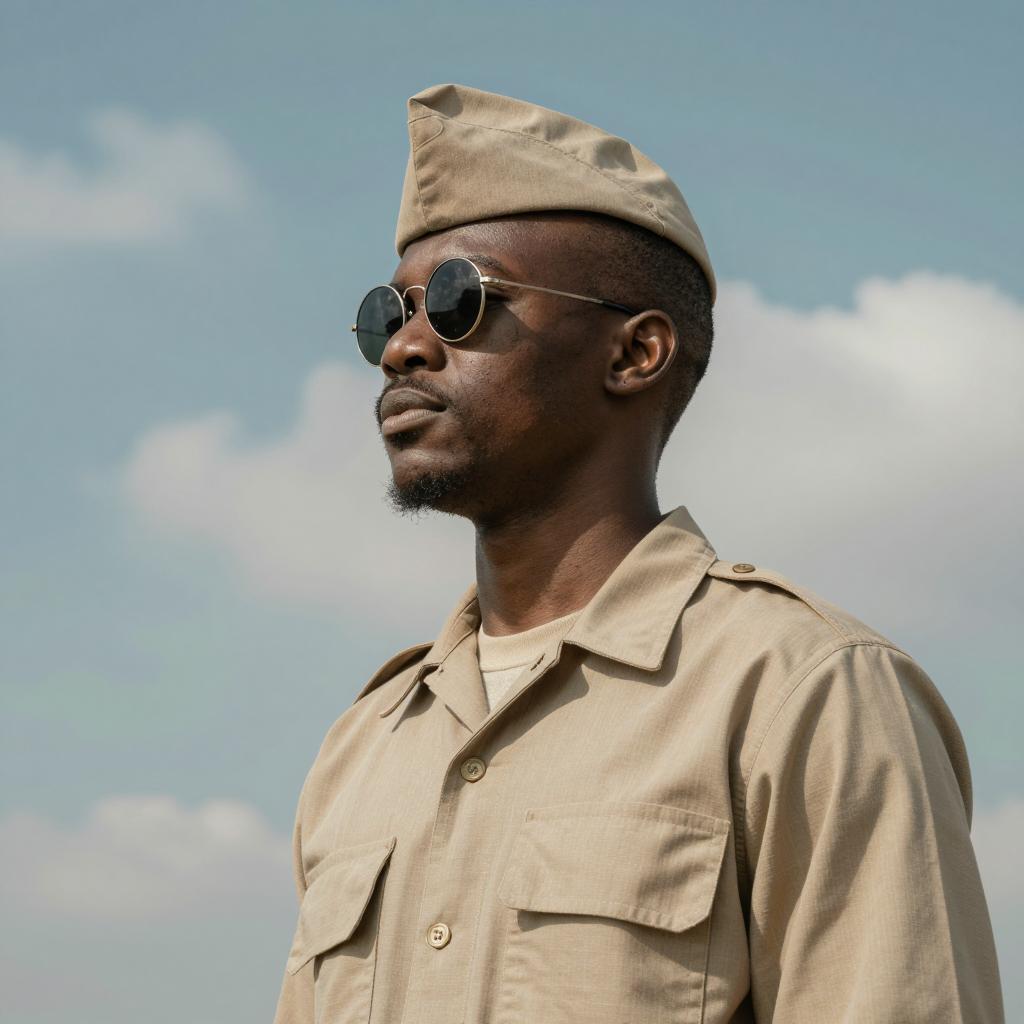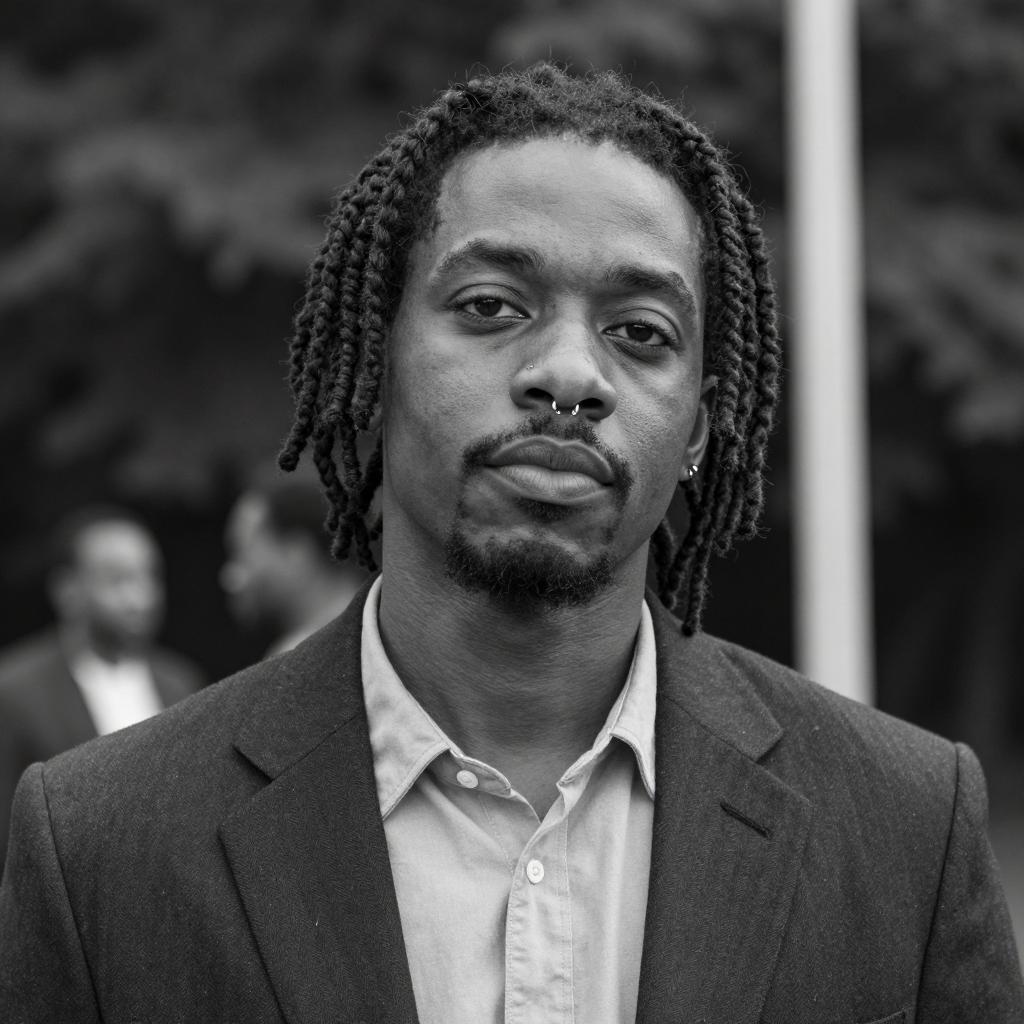 Portrait of a bald Black man with a mustache wearing a dark shirt, standing in front of a large American flag. The man is illuminated with purple and blue lighting, creating a dramatic contrast with the red, white, and blue flag in the background. He looks to the left with a neutral expression, his face mostly in shadow except for his eyes and mustache.