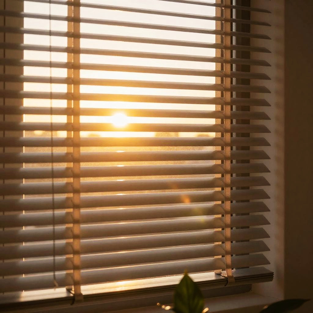This is a photograph of a sun setting behind horizontal window blinds. The bright, golden sun peeks through the slats, casting a warm glow. In the lower part of the image, there's a hint of green plants against a soft, white wall. The shadows from the blinds create a pattern across the scene, adding a sense of depth and contrast. The overall mood is calm and warm.