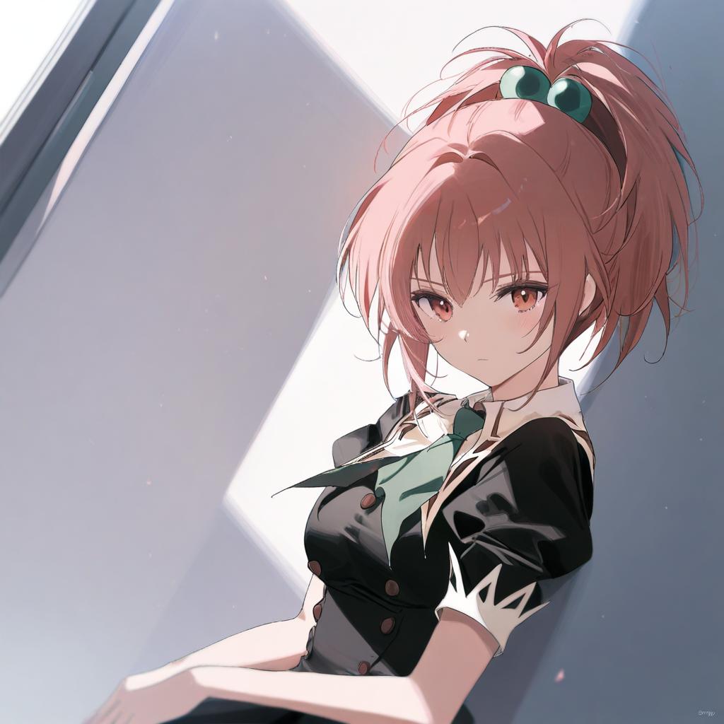 Digital anime-style illustration of a girl with red hair tied in a ponytail, wearing a black and white school uniform with a green tie. The character has red eyes and a serious expression, illuminated by soft natural light in a stylized setting.