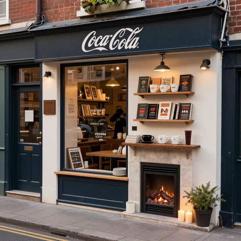 "Coca-Cola cozy coffee shop on charming street with shops. Coffee shop has books and coffee cups on shelves. There is also a fireplace and a few candles.,"