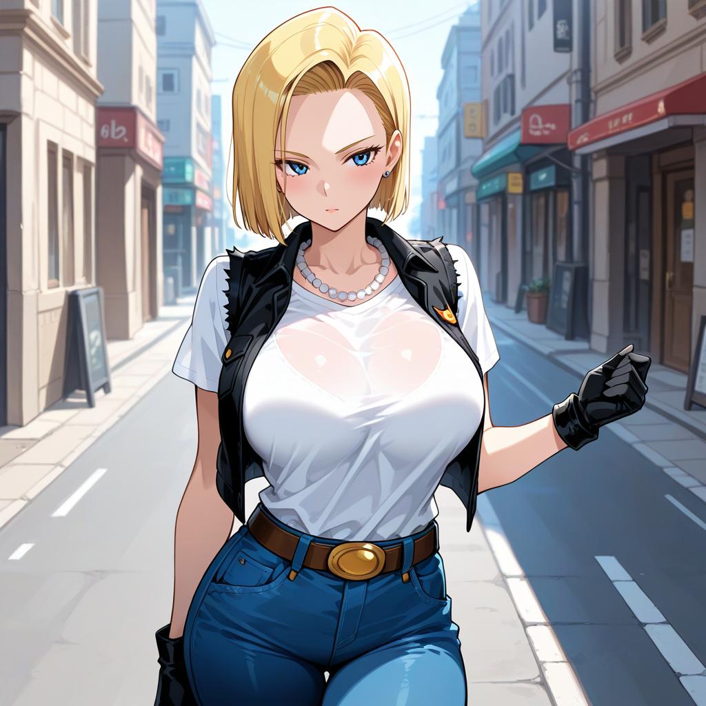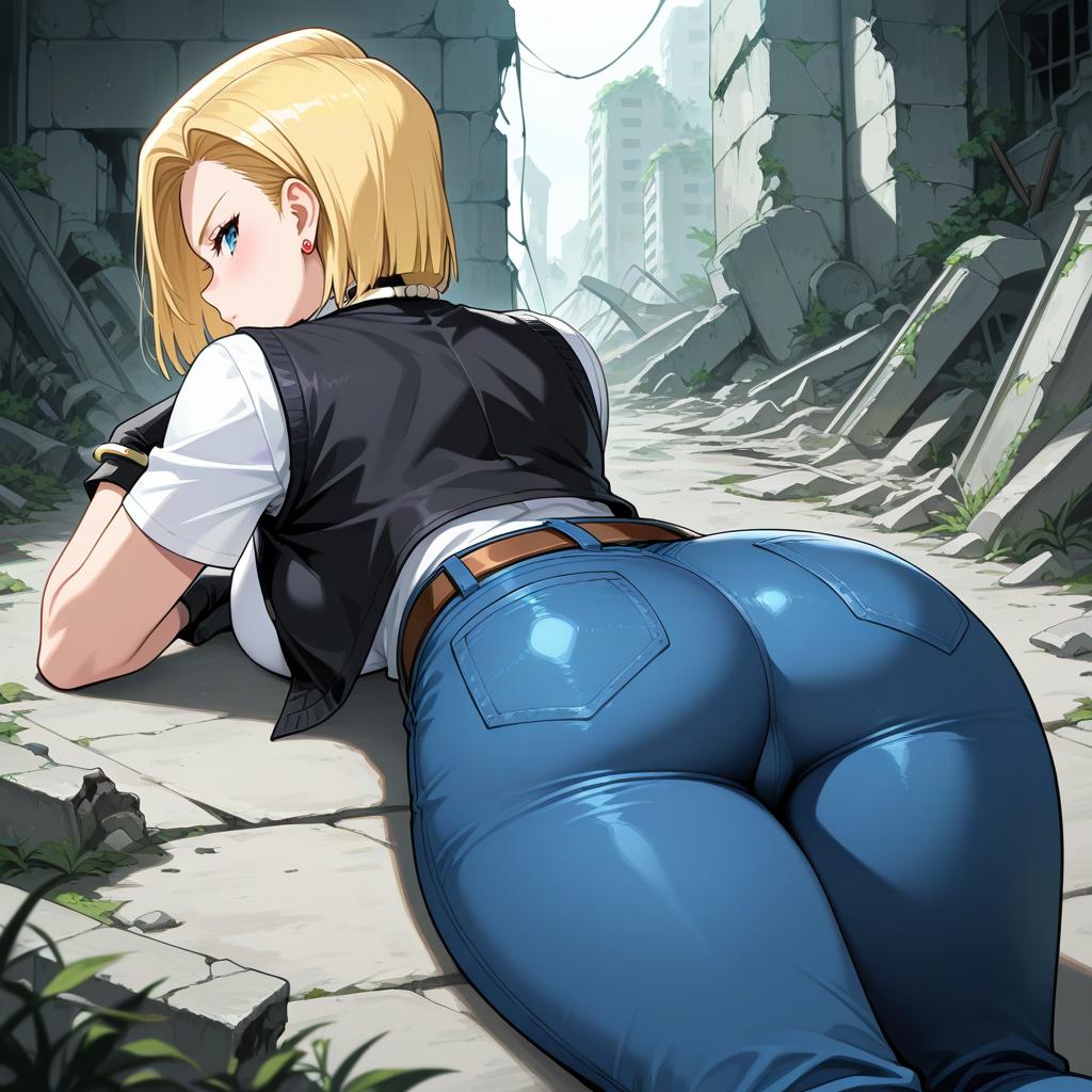 Best quality, ultra high res, prefect anatomy, 20yo kdoll, sfw, 1girl, android 18, solo, blonde hair, blue eyes, short hair, earrings, jewelry, denim vest, open vest, black pantyhose, black shirt, denim skirt, white striped long sleeves, blue skirt, accidental exposure panties, sitting, closed eyes