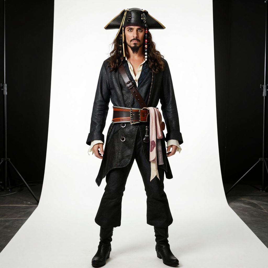 Orlando Bloom Pirates Caribbean Costume, pirate in a black outfit standing in a room with a white background