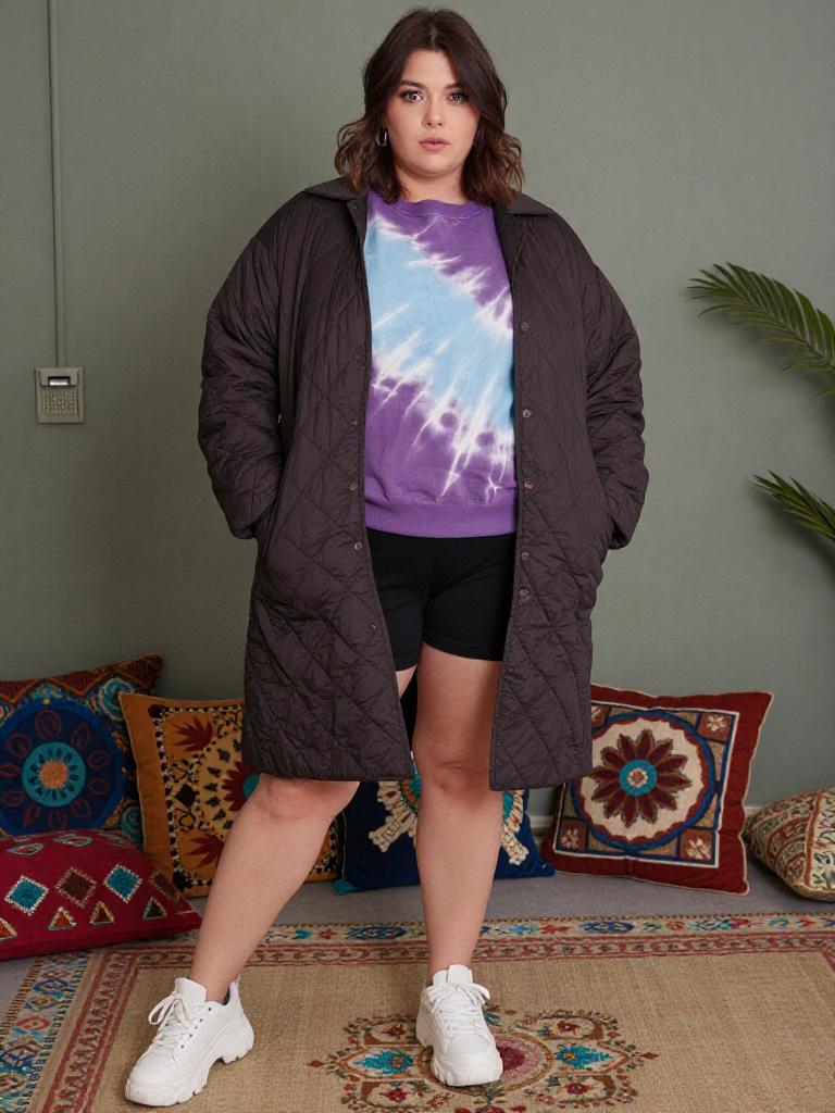 A Plus-size woman in casual streetwear, wearing a dark brown oversized quilted coat, hands in pockets, with a tie-dye sweatshirt in blue and purple underneath, black shorts peeking out, and chunky white lace-up sneakers. She stands in a Bohemian lounge with colorful cushions, embodying a vibrant Cibachrome visual style. Sexy. Pretty face and beаutiful eyes. Big breasts