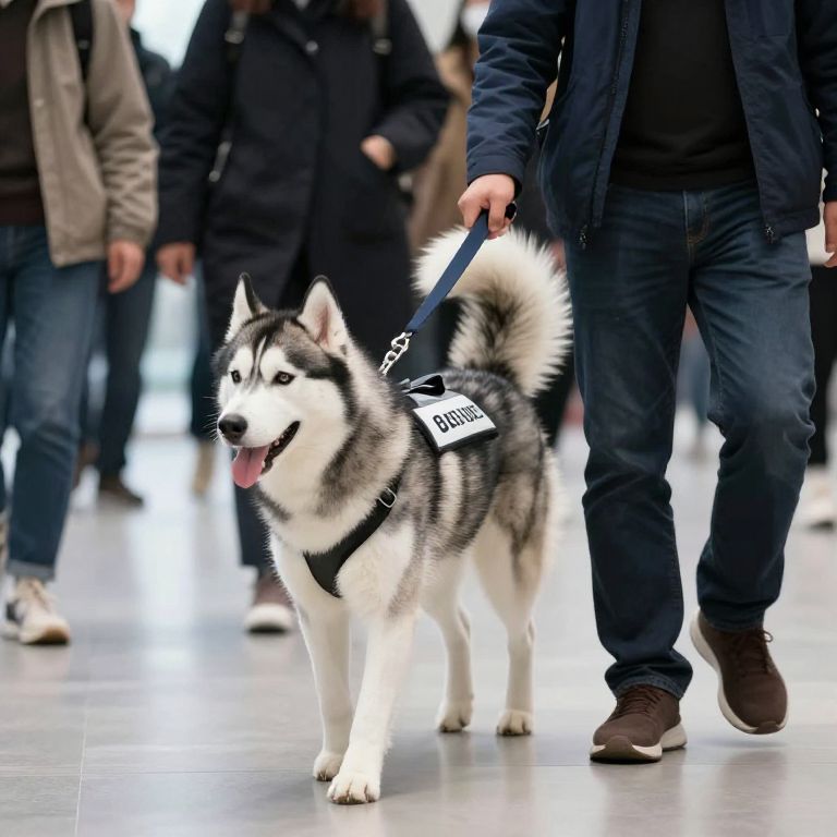 Siberian husky service dog navigating an indoor public space, expertly guiding its handler through crowds, clear service vest visible, soft natural lighting, modern architectural interior with subtle reflections, painted in a realistic but vibrant artistic style