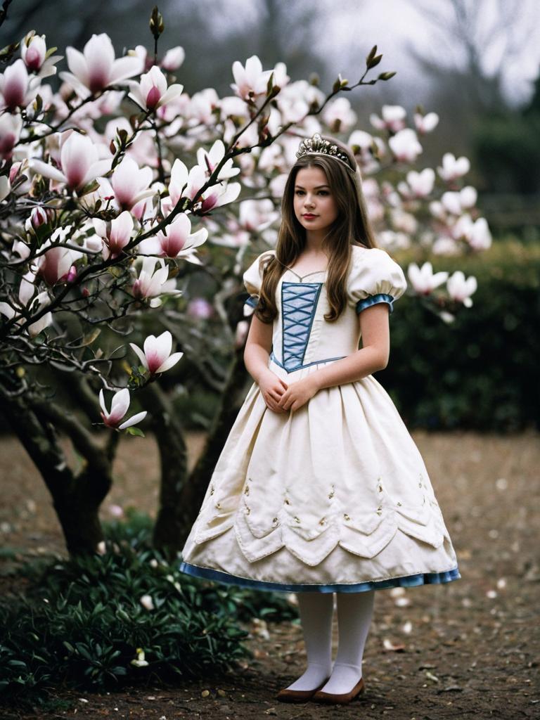 Princess magnolia costume, 1girl, brown hair, dress, solo focus, long hair, outdoors, blurry, looking at viewer, blurry background, full body, flower, standing