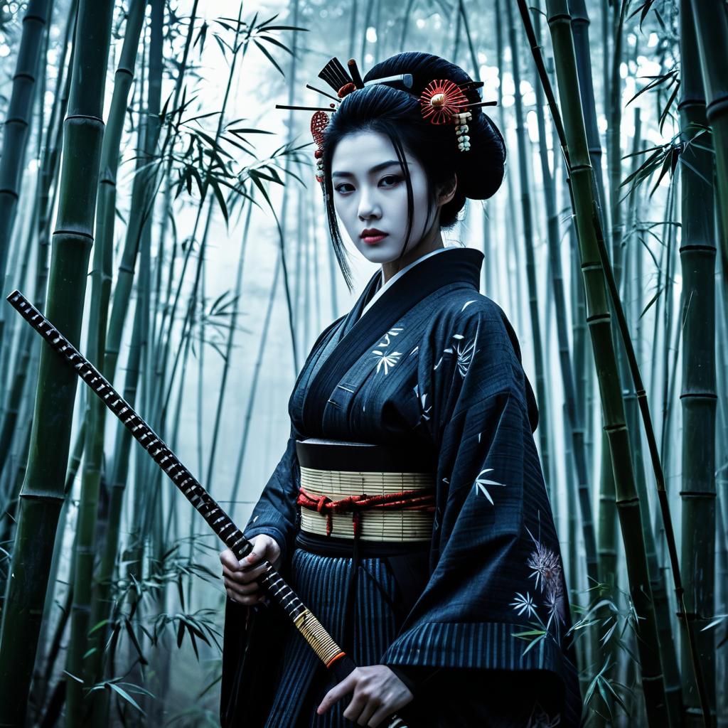 A dynamic portrait of a female samurai warrior in ancient bamboo forest at dawn, with glowing cybernetic enhancements, volumetric lighting and razor-sharp focus, in traditional ukiyo-e infused with modern digital painting techniques.