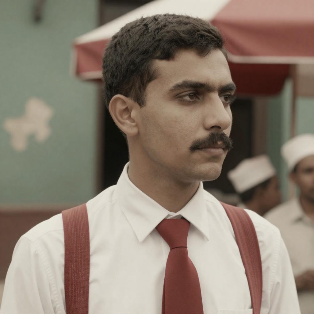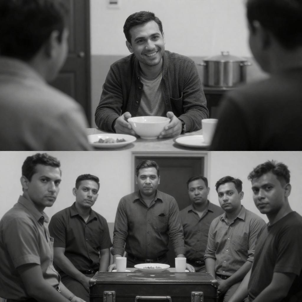 Black-and-white photograph of two scenes. Top: man with short dark hair, smiling, sits at table with two others, holding bowl. Bottom: five men, serious expressions, gathered around suitcase. Table with plates, cups, and metal containers in background.
