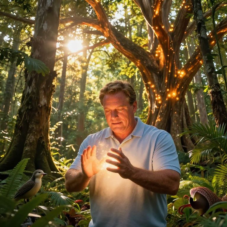 Ron DeSantis heals a mystical forest, bathed in warm sunlight, ancient trees glowing with vibrant energy, serene atmosphere, peaceful wildlife surrounding him, healing light radiating from his hands, fantasy landscape, magical realism style