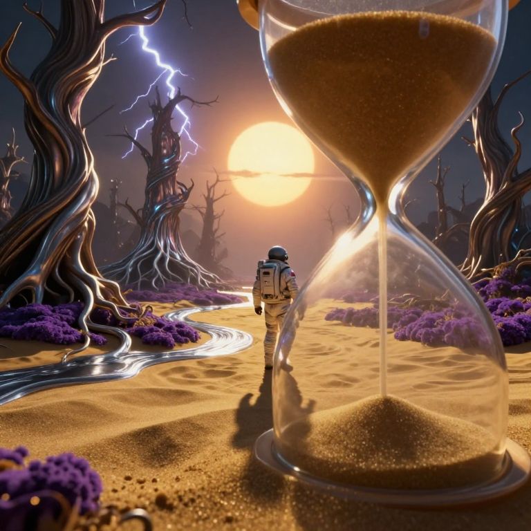 Imagine an extraordinary scene from a first-person perspective, peering through the eye of a colossal hourglass grain of sand. This dreamlike landscape features organic and inorganic elements intertwining; trees with metallic bark twist upwards into lightning-struck towers, while their roots morph into flowing rivers of liquid silver. A lone astronaut wearing a tattered spacesuit adorned with iridescent patterns traverses this enigmatic terrain, his shadow cast upon the ground as he stands on an island of vibrant purple moss surrounded by a sea of molten gold. The surreal illumination, reminiscent of a dying sun, casts long, dramatic shadows that dance across the textured surfaces, evoking feelings of mystery and introspection in this captivating visual tapestry.