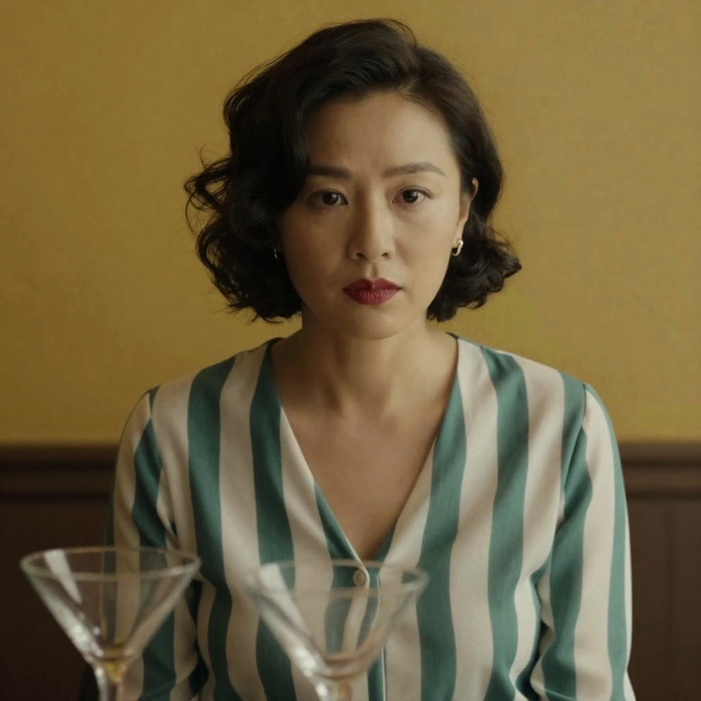 Photograph of a woman with short curly dark hair, wearing a striped green and white blouse, red lipstick, and small earrings. She has a serious expression and is seated, with two martini glasses in the foreground. Golden ured wall in the background.