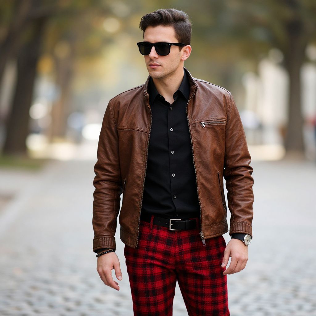 Photograph of a stylish man with dark hair, black sunglasses, brown leather jacket, black shirt, and red plaid pants, standing on a blurred