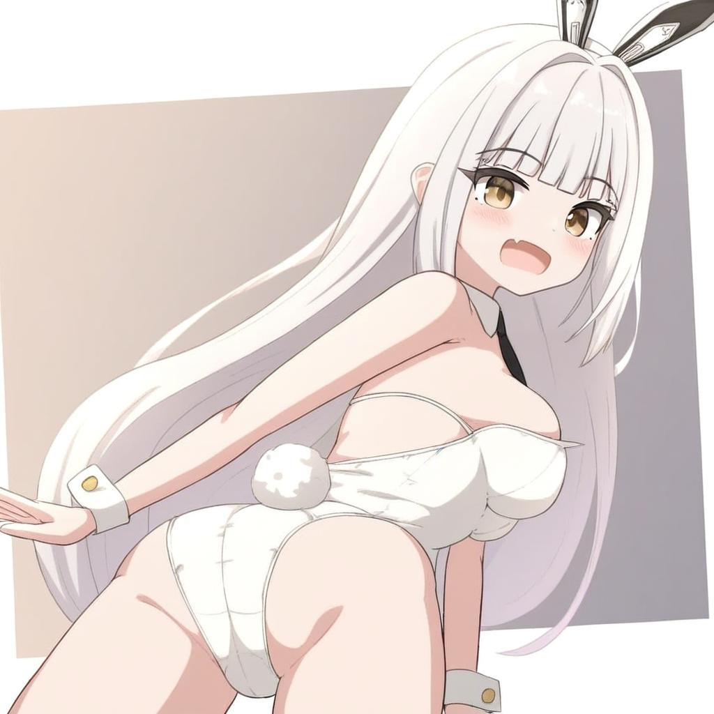 Blanc (nikke), goddess of victory: nikke, 1girl, skin fang, rabbit ears, rabbit tail, fake animal ears, yellow eyes, white hair, very long hair, blunt bangs, hair intakes, medium breasts, large breasts, cleavage, thighs, ass, highleg leotard, white leotard, strapless leotard, highleg leotard, detached collar, bare shoulders, black necktie, playboy bunny, playboy bunny, wrist cuffs, by artist nora wanko, leet