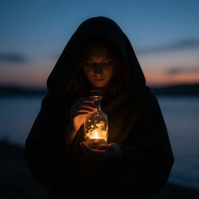 Photograph of a person with a dark hood, standing against a twilight sky, holding a glowing glass jar with a lit candle inside. The person's face is partially illuminated by the warm candlelight, casting shadows over their features. The background is a blurred mix of deep blue and orange hues, suggesting a sunset over a body of water. The person's hands are gently gripping the jar, and their expression is focused and contemplative. The overall mood is serene and mysterious, with the contrast between the dark hood and the bright candlelight creating a dramatic effect.