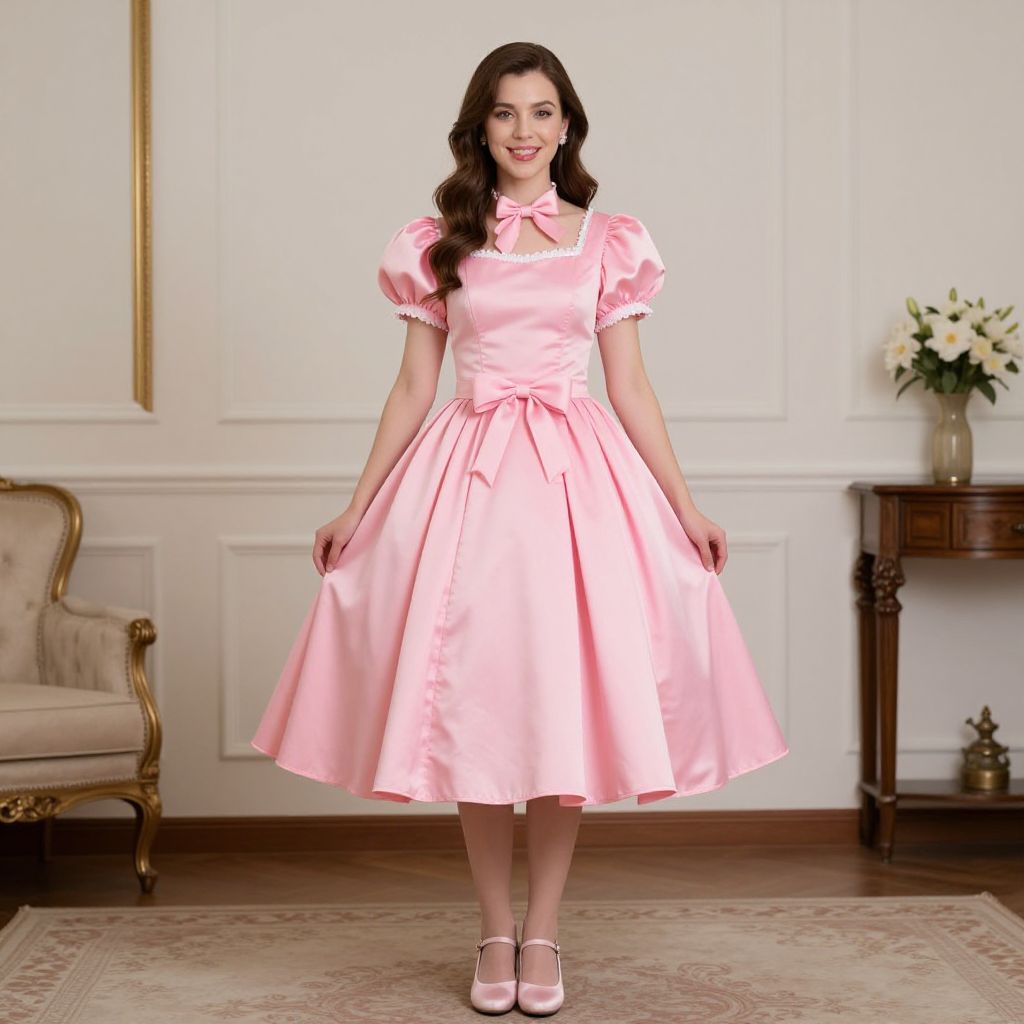 Photograph of a young woman standing in an elegant, vintage-style room. She has fair skin, dark brown wavy hair, and a cheerful smile. She wears a pink, satin, puffed-sleeve dress with a bow at the neck and a cinched waist, paired with pink Mary Jane shoes. The dress has a full, flared skirt. The background features white paneled walls, a gold-framed picture, a beige upholstered chair with wooden arms, and a wooden side table with a vase of white and green flowers. The floor is wooden, and a patterned rug is partially visible. The overall style is reminiscent of 1950s fashion.