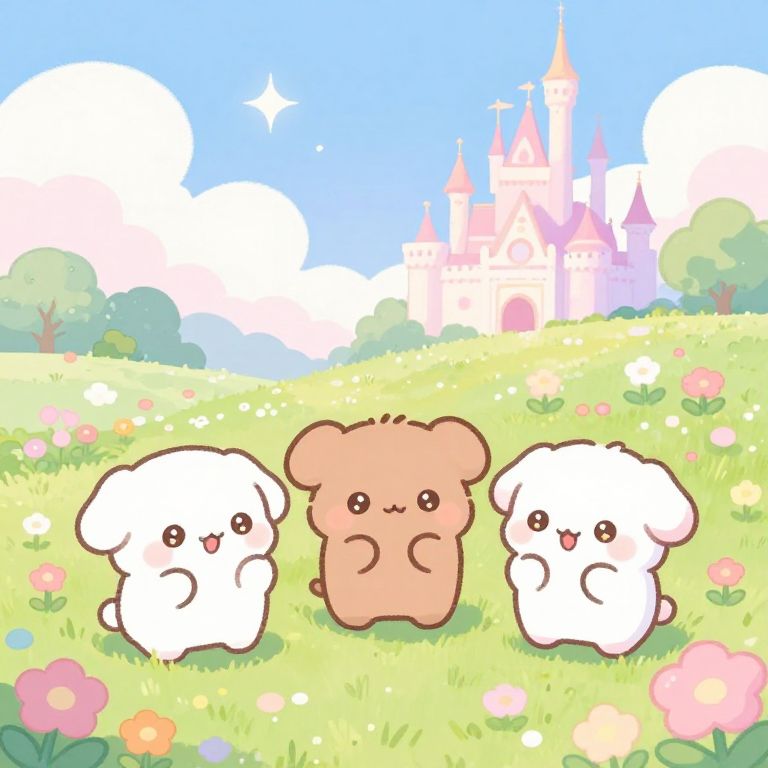 Kawaii characters in a pastel fantasy landscape, cute animals with big sparkling eyes, soft fluffy clouds, colorful flowers, a magical castle in the background, gentle sunlight, and playful whimsical mood, digital art style