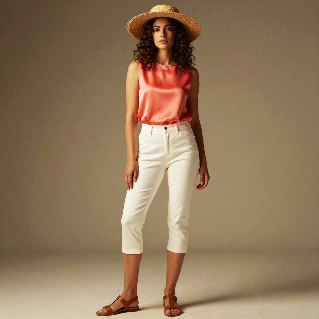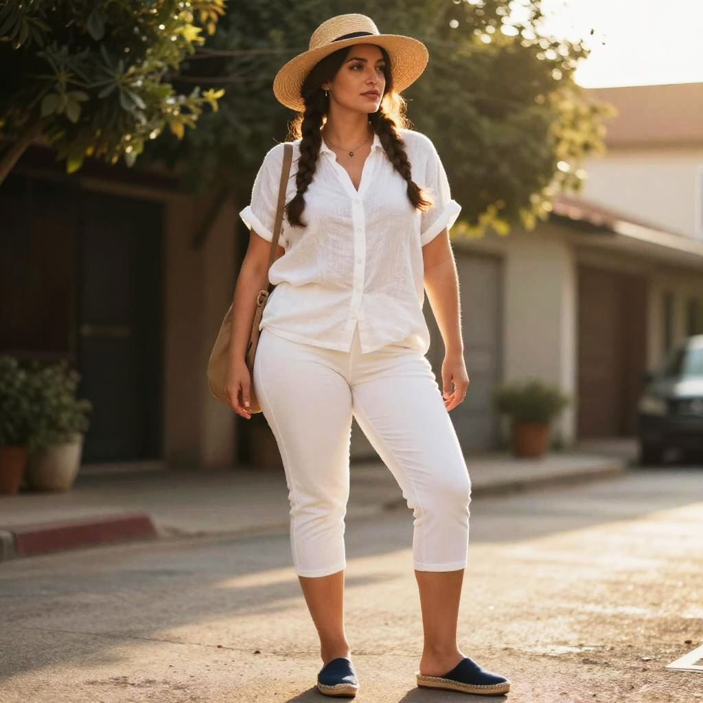 Photo. Slim woman, Messy Pixie, summer outfit, White linen shirt, short sleeves, relaxed fit and Denim shorts, light wash, frayed hem, white linen, light wash denim, polaroid instant camera, golden hour light