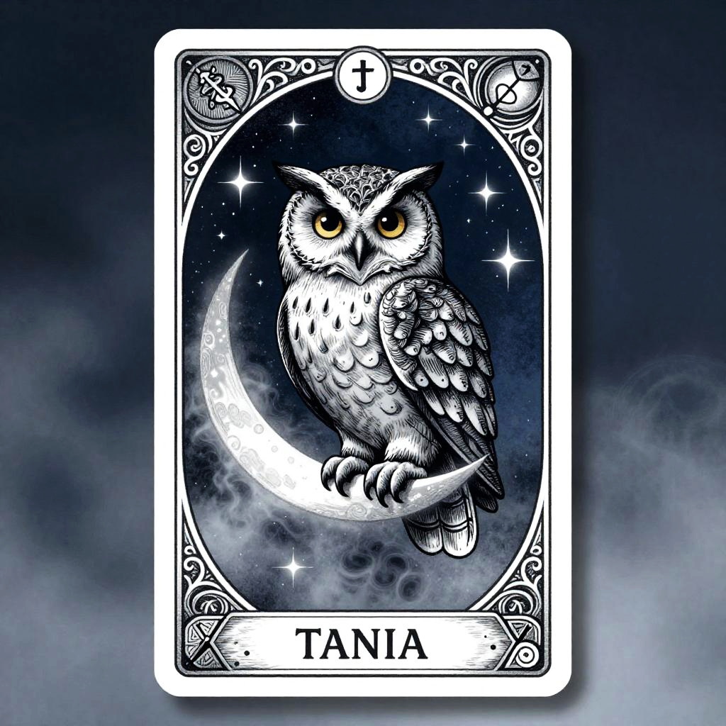 Tarot card style representation of a wise owl perched on a crescent moon, intricate filigree border with arcane symbols, cool color scheme with silvers and deep blues, mystical fog and sparkling stars, detailed pen and ink style with soft shading.