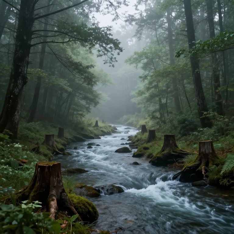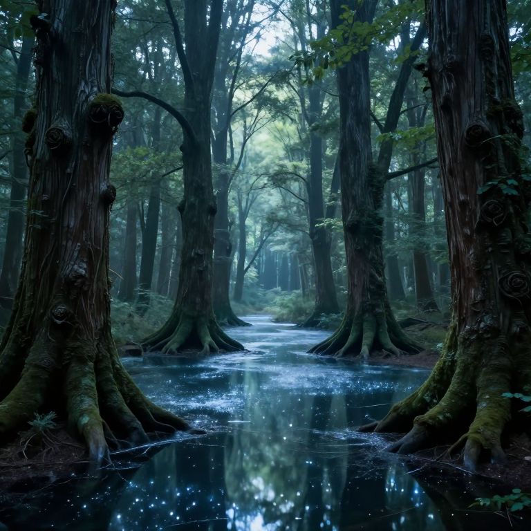 Photograph of a dense, misty forest with towering, moss-covered trees flanking a narrow, reflective stream. The forest floor is dark and earthy, while the stream glistens with a blue hue, mirroring the trees and sky above. Soft, diffused light filters through the dense canopy, creating a serene, ethereal atmosphere. Sparkling, bioluminescent-like dots are visible in the water, adding a magical touch. The background fades into a misty, greenish-blue blur, enhancing the depth and tranquility of the scene.