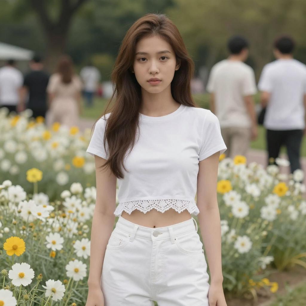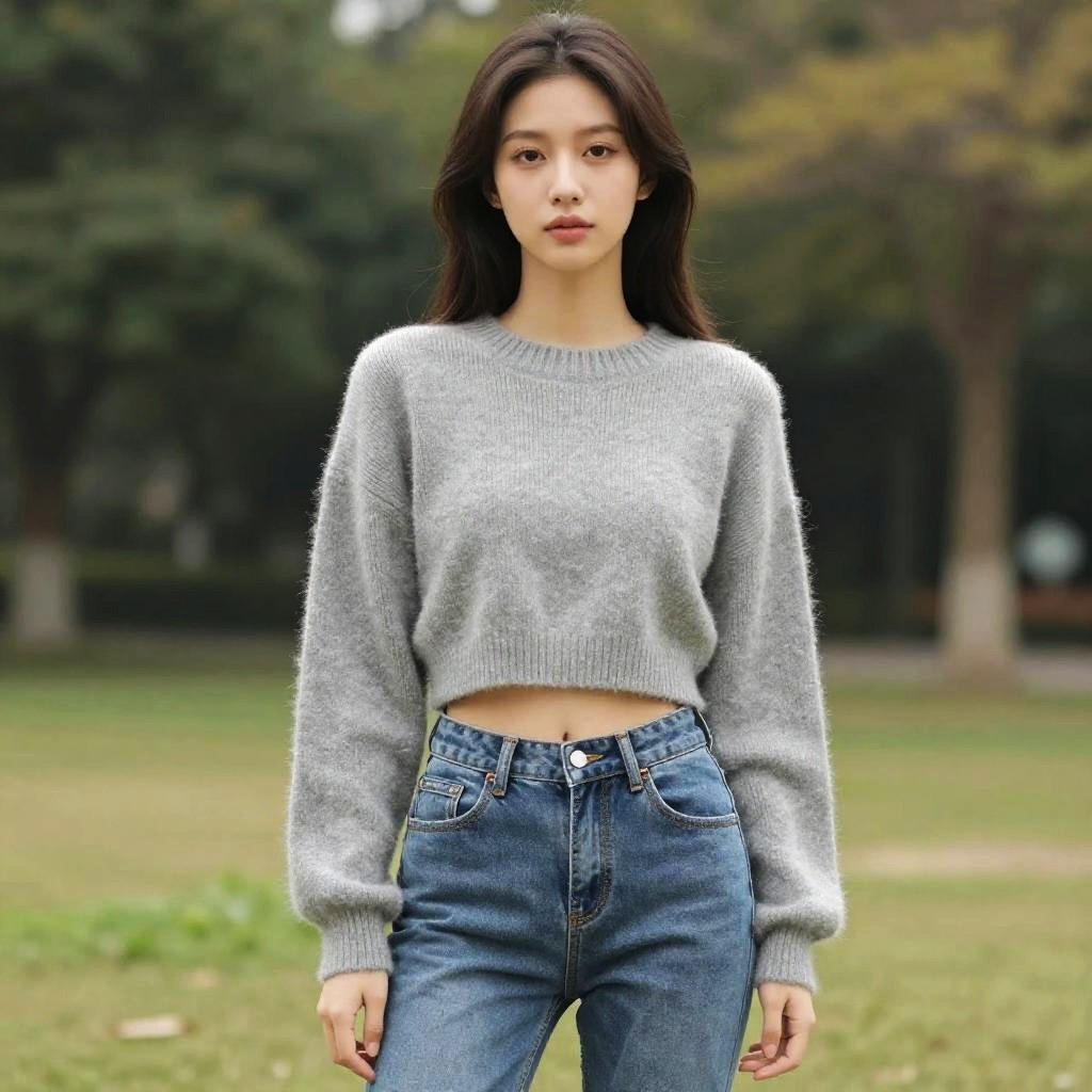 A young woman stands confidently in an outdoor park setting, wearing a cozy grey cropped sweater and high-waisted jeans. The natural background features soft-focus greenery and trees, highlighting the casual and modern fashion style captured in natural light.