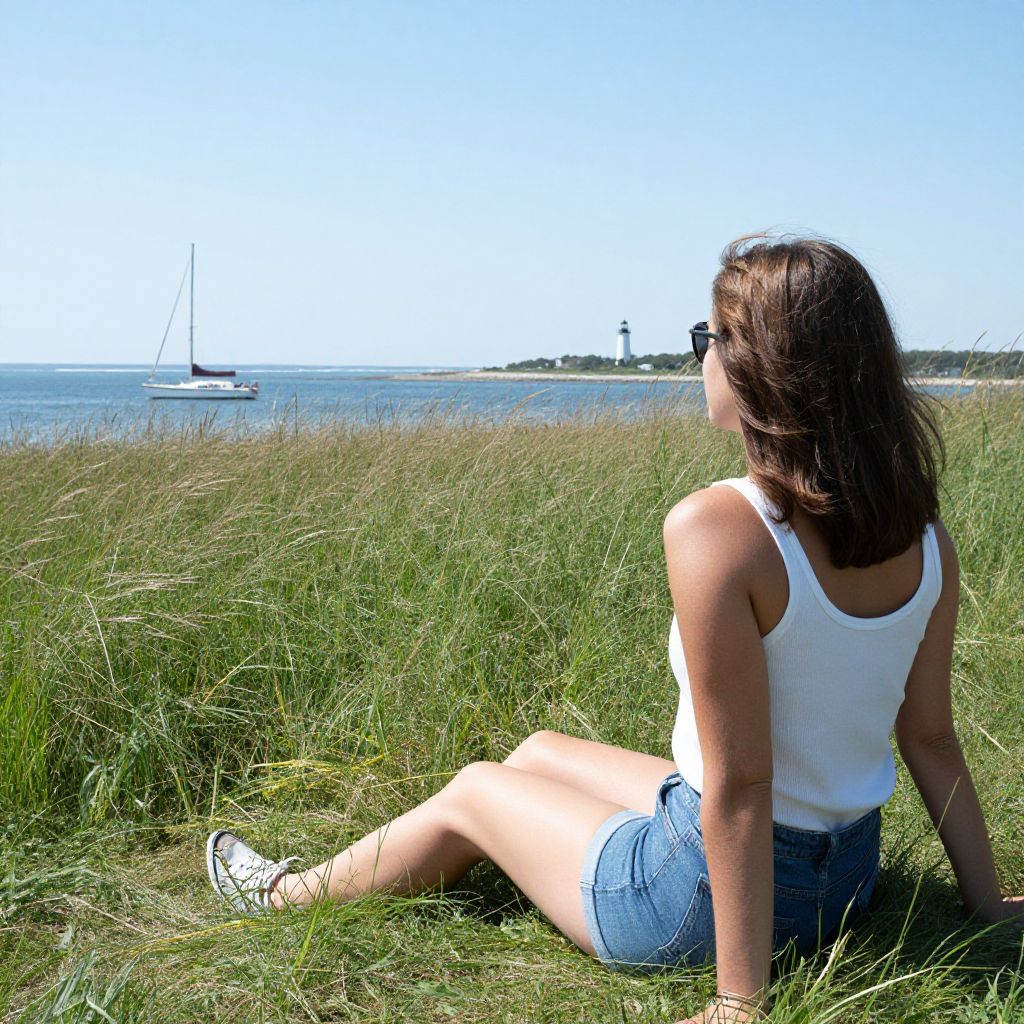 Woman seated gracefully in tall green grass overlooking a serene coastal scene with a sailboat and distant lighthouse under a clear sky, evoking the charm of Nantucket.