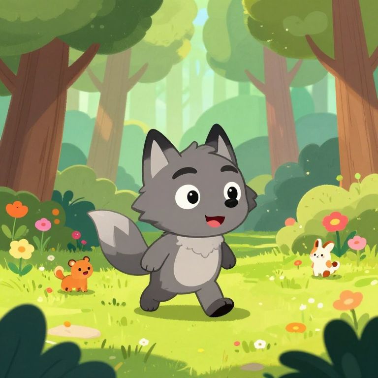 Cartoon-style illustration of a cheerful gray wolf cub with a white belly, walking through a colorful, sunlit forest with flowers, trees, and smaller