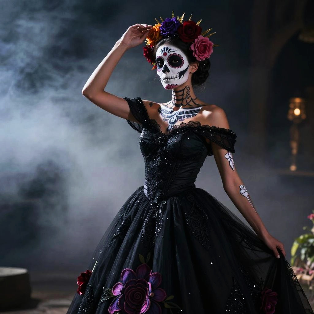 Dia de los muertos, skimpy black bridal gown, photorealistic, intricate, cinematic lighting, dark atmosphere, volumetric lighting, action pose, epic scene, lots of fine detail, movie style, photography, natural textures, natural light, natural blur, photorealism, cinematic rendering, ray tracing, highest quality, highest detail, Cinematic, Blur Effect, Long Exposure, 8K, Ultra-HD, Natural Lighting, Moody Lighting, Cinematic Lighting, hyper-realistic, vibrant, 8k, detailed, ultra detail, atmospheric fog, dark hue, face focus, looking at viewer, front view, from below