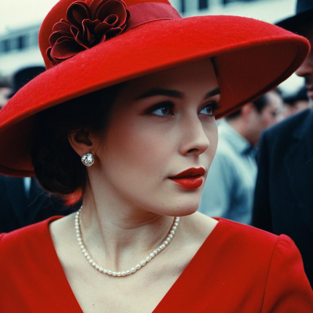 Among Costume Red, a close up of a woman in a red dress and a red hat