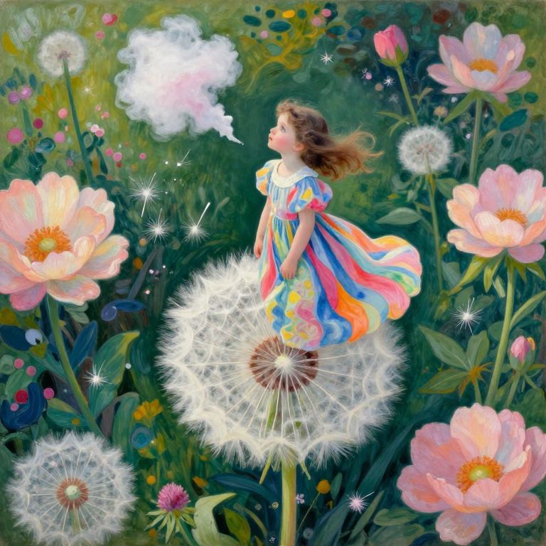 A whimsical portrait in the style reminiscent of Paul Cézanne's post-impressionist technique features an endearing young girl draped in a vivid, flowing dress amidst a verdant garden filled with oversized blossoms in warm pastel shades. From a distinctive aerial perspective, viewers are beckoned to observe her as she stands atop an enlarged dandelion, gazing wistfully at the heavens above, while tendrils of cotton candy-like seeds drift languidly around her. This captivating scene conjures up feelings of nostalgia and enchantment, artfully merging reality with fantasy through a harmonious interplay of color and shape.
