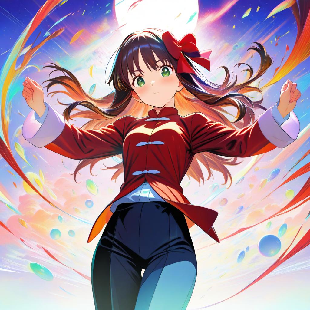 Arima miyako, tsukihime, 1girl, green eyes, long hair, brown hair, hair bow, tangzhuang, by artist nababa, animagine