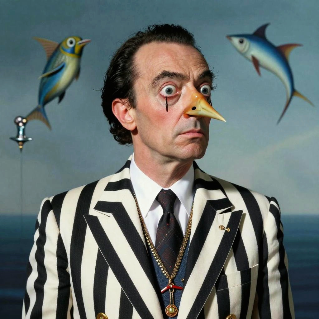 Realistic photo.A man with a bird-like face, set against a conceptual background representing Neptune in Pisces. Dressed in a black and white striped and checkered suit, the style combines influences of Salvador Dalí, Surrealism. Rendered as a hyperrealistic photo, the composition captures a surreal, Farinetti-inspired artwork concept, with intricate, futuristic details and a thought-provoking aesthetic. realistic photo