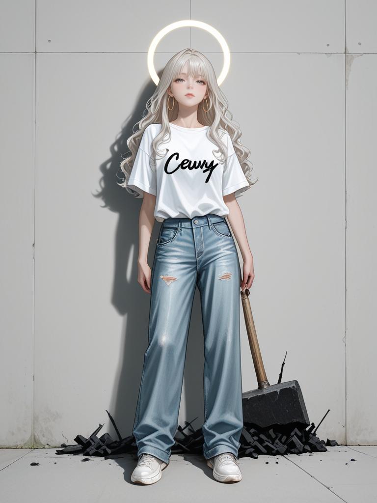 Digital artwork of a pale-skinned, blonde-haired girl with long, wavy hair, standing against a gray, industrial wall. She wears a white T-shirt with "Crazy" in black cursive, loose, light blue jeans with rips on the thighs, and white sneakers. A halo hovers above her head. A shovel with black debris lies on the ground to her right. The lighting is stark, casting sharp shadows. The overall style is modern, with a slightly anime-inspired aesthetic.