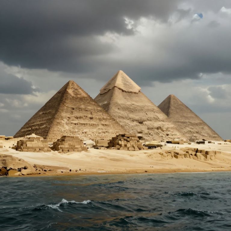 Photograph of three ancient, weathered pyramids with triangular, sandy-colored stone facades standing on a sandy plateau. The pyramids are positioned from left to right, with the largest in the center. Dark, stormy clouds loom overhead, contrasting with the bright sunlight peeking through. In the foreground, dark blue, slightly choppy water is visible, with small waves breaking against the shore. The sandy ground is scattered with smaller, dark rocks. The overall color palette includes sandy browns, dark blues, and grayish clouds, creating a dramatic, historic landscape.
