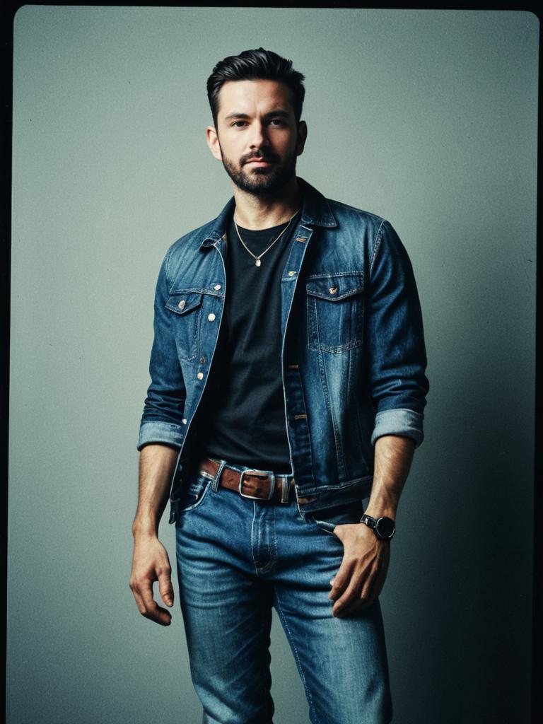 Man in Stylish Jeans Outfit, cinematic realism, stylish casual portrait