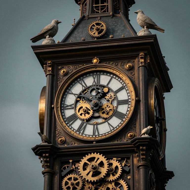 An enigmatic steampunk clock tower, adorned with mechanical gears and perched by stone-hearted birds, chimes in reverse, its ticking echoes a haunting symphony of time unraveling, evoking a profound sense of transience and the relentless pull of memory.