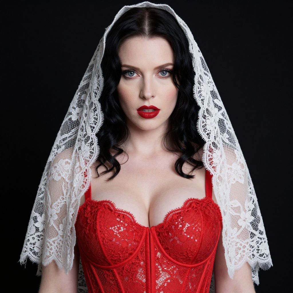 Photograph of a pale-skinned woman with dark, wavy hair, wearing a white lace veil that drapes over her shoulders. She has striking blue eyes and bold red lipstick. She's dressed in a red lace corset that highlights her large breasts, with intricate lace patterns on the fabric. The background is solid black, making her and her outfit stand out vividly.