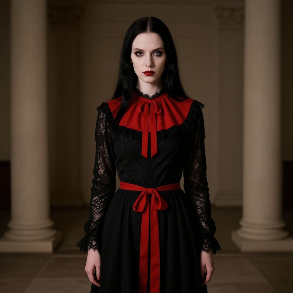 Photograph of a pale-skinned woman with dark, straight hair and red lipstick, standing in a dimly lit, classical-style room with beige columns. She's wearing a black, lace-trimmed dress with long sleeves, a wide red collar, and a bright red ribbon tied at the waist. The dress has a gothic, vampire-like vibe, and she looks directly at the camera with a serious expression.