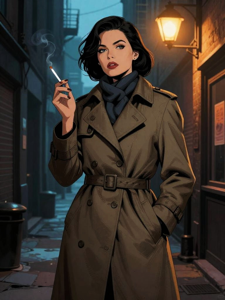 Mysterious bounty hunter in foggy harbor dock at night, wearing sleek tactical coat with many pockets, holding steaming paper coffee cup, moody lighting, electric blue and hot pink, cinematic, highly detailed, dramatic, graphic novel illustration, 2d shaded retro comic book