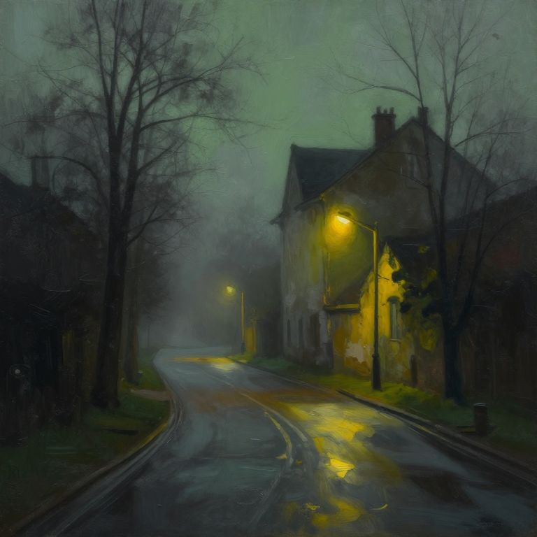 This digital painting depicts a misty, nighttime street scene. A narrow, wet road curves gently to the left, reflecting the soft yellow glow of a single streetlamp on the right. Tall, leafless trees frame the road on both sides, their dark silhouettes adding to the eerie atmosphere. A large, old stone house with a steep, gabled roof and two chimneys stands on the right, its warm yellow light contrasting with the cool, dark blue and green hues of the misty night. The background fades into a dense, foggy haze, enhancing the sense of mystery and isolation. The overall mood is moody and atmospheric.