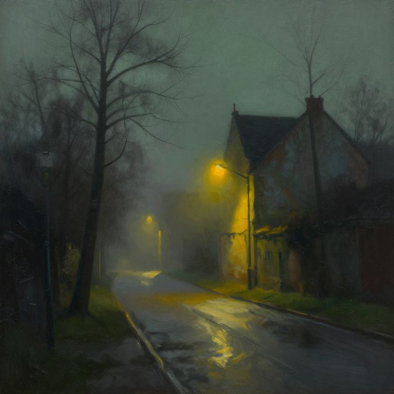 A modern abstract oil painting by Bruce Holwerda depicting a misty, atmospheric street scene at night, The image is dominated by a narrow, winding road that curves gently to the right, disappearing into the fog, The road is wet, with a glistening texture suggesting recent rainfall, On the left side of the road, a tall, leafless tree stands bare against the dark, foggy sky, To the right, another tree, also leafless, is visible, The background features an old, dilapidated building with a pitched roof and multiple chimneys, partially obscured by the fog, The building's walls are rough and weathered, indicative of age, The streetlights on either side of the road emit a warm, yellowish-orange glow, contrasting sharply with the cool, muted tones of the fog and the dark, almost black, shadows, The lights cast long, soft shadows on the ground, enhancing the eerie, almost ghostly atmosphere, The overall color palette is dominated by greens, greys, and blacks, with occasional bursts of warm yellow from the streetlights, The image exudes a sense of solitude and melancholy, with a hint of mystery and the passage of time, loose brushwork, vibrant color, light and shadow play, captures feeling over form